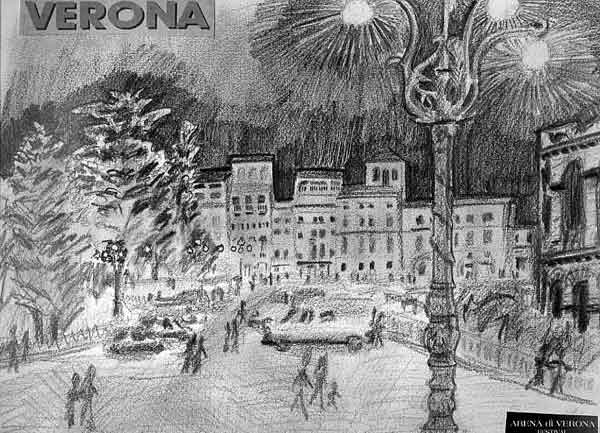 Verona at nighttime proves that it deserved Romeo and Juliet; I saw Aida in the Roman coliseum on the far right.